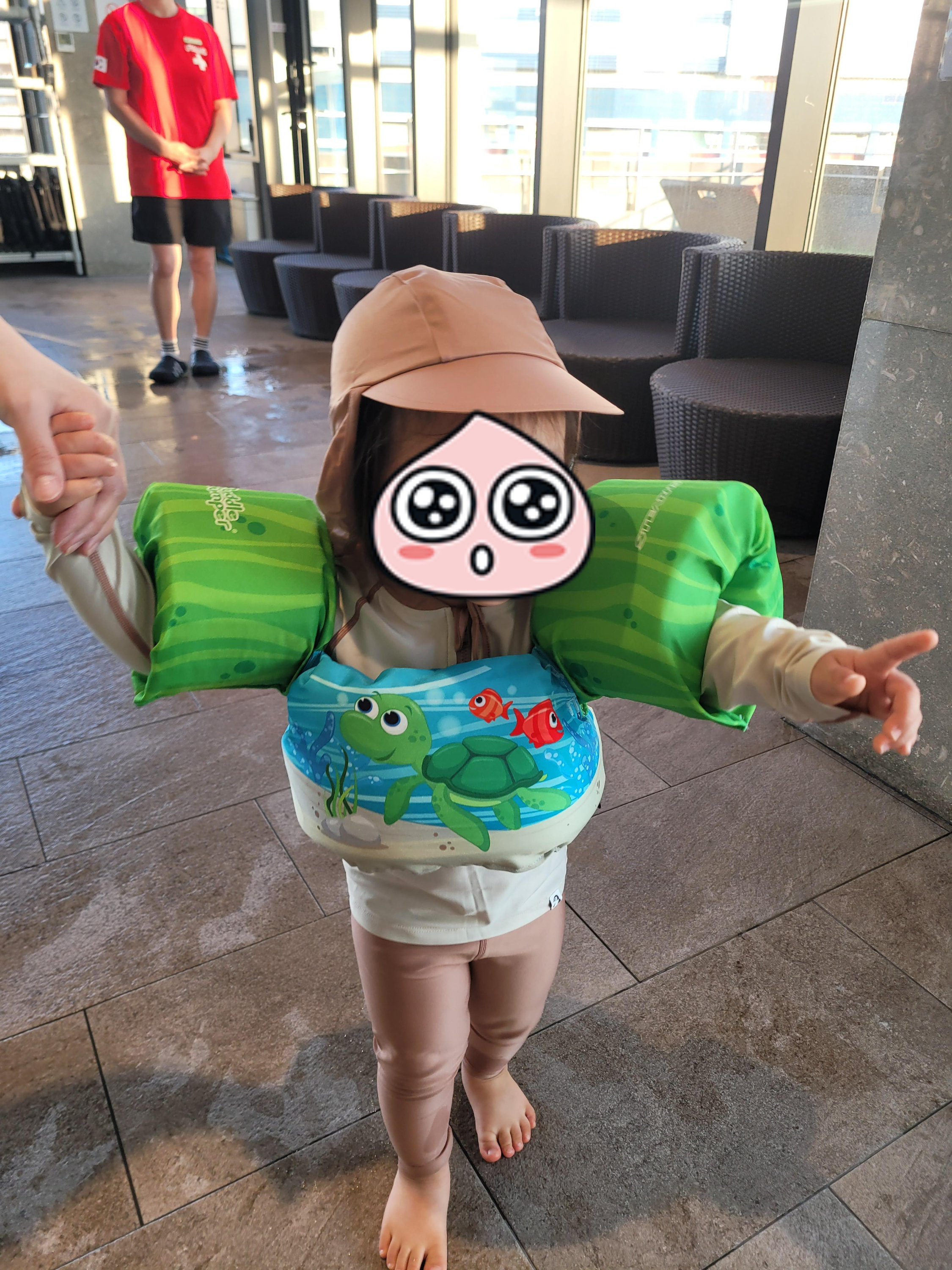 저희 아기는 구명조끼 입기에는 아직 작아서 암튜브를 빌려 착용하였습니다.
