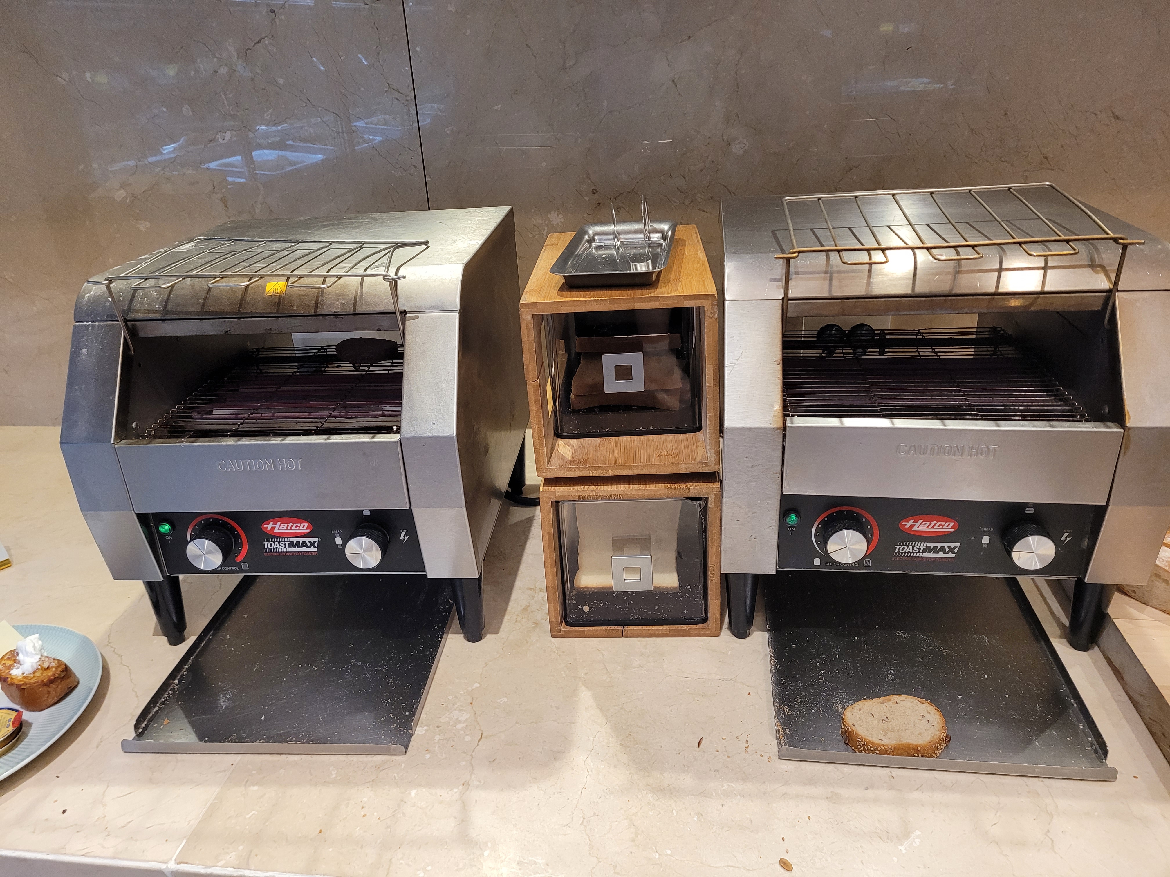 한 곳은 따뜻한 음식 위주, 다른 한 곳은 빵과 과일 코너,